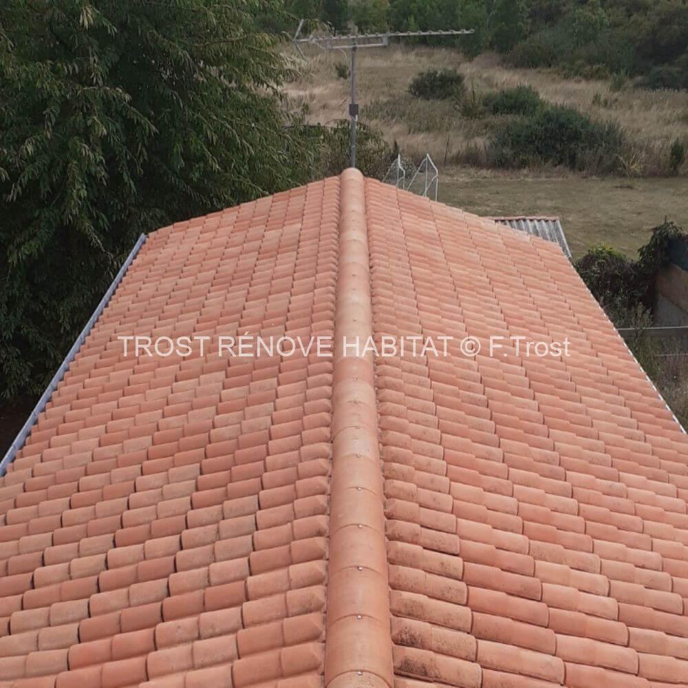 Sur ce chantier, nous avons réalisé le démoussage d’une toiture de maison à Chemillé. Application d’un anti-mousse désincrustant sur une toiture en tuiles Romane Canal.