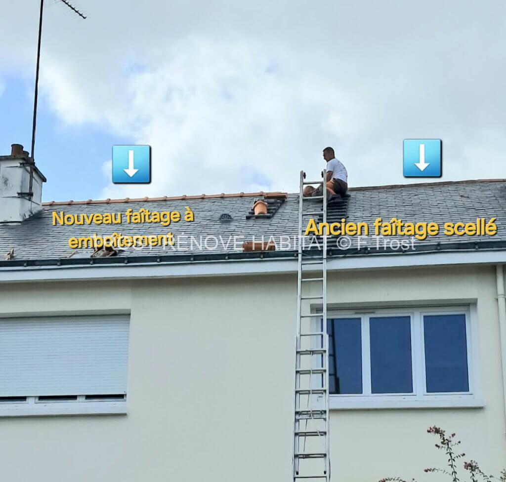 Ce type de faîtage, en plus d’être robuste, permet une meilleure ventilation de la toiture, limitant ainsi la condensation et prolongeant la vie des matériaux. Pour ce chantier sur Angers, nous avons soigneusement retiré l’ancien faîtage scellé, nettoyé et préparé le support avant de poser le système à emboîtement. Résultat : une couverture solide, esthétique et surtout parfaitement étanche.