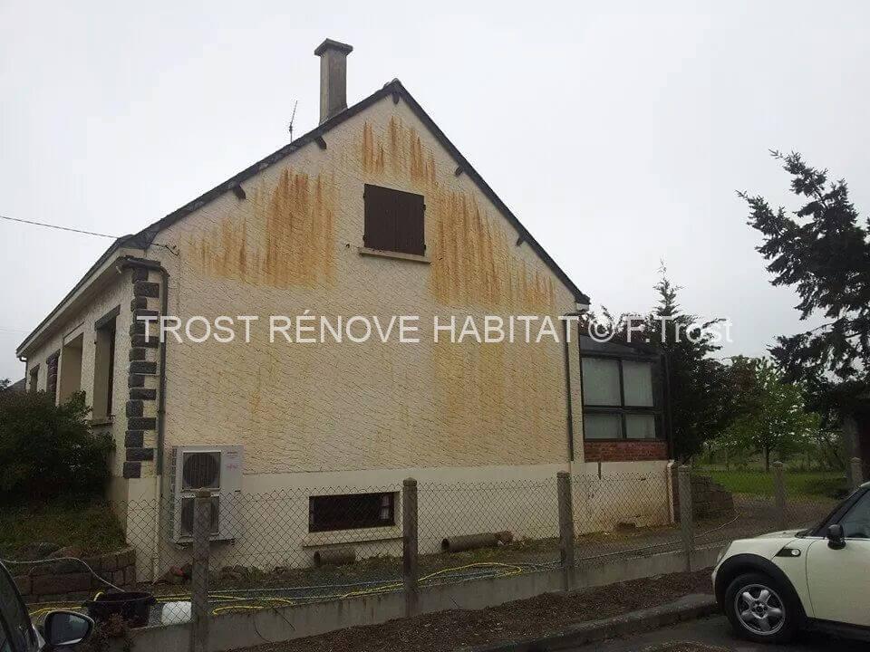 Sur ce chantier, nous avons réalisé le nettoyage d’une façade pignon à Beaulieu-sur-Layon. Nous avons appliqué un désincrustant sur les traces rouges, puis rinçage au jet basse pression.