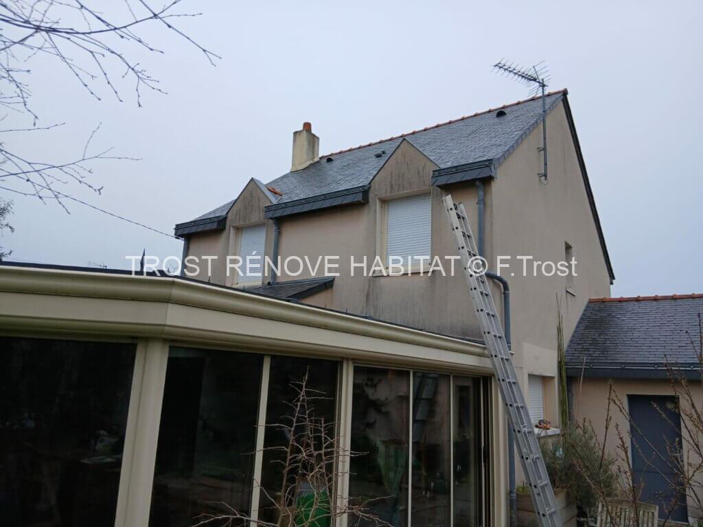 Sur cette intervention réalisée à Trélazé, nous avons procédé au nettoyage complet de la façade ainsi que du pignon d’une maison. Le support étant un enduit gratté, nous avons appliqué un anti-mousse désincrustant spécialement adapté afin d’éliminer les dépôts, les traces de pollution et les micro-organismes qui ternissent l’aspect du mur avec le temps.